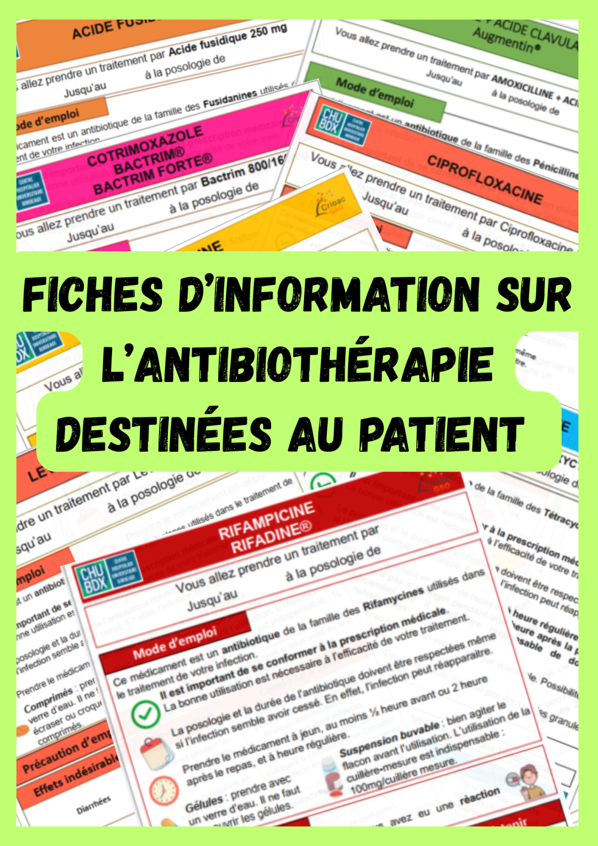 Ces fiches, qui se veulent synthétiques, accessibles et pédagogiques, peuvent néanmoins être utilisées pour des infections plus simples, avec une adaptation du suivi, selon l’infection. Elles permettent de transmettre les messages clés à connaître avant et pendant la prise d’un anti-infectieux.